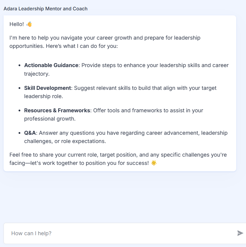 To support the development of future leaders within the organization, we designed and implemented an AI-powered Leadership Coach & Mentor Chatbot, which we named Adara. This intelligent digital assistant provides on-demand, personalized guidance to employees transitioning into leadership roles. The chatbot serves as both a performance support tool and a developmental mentor, helping users build confidence, learn core leadership competencies, and access curated resources aligned with their career growth goals.